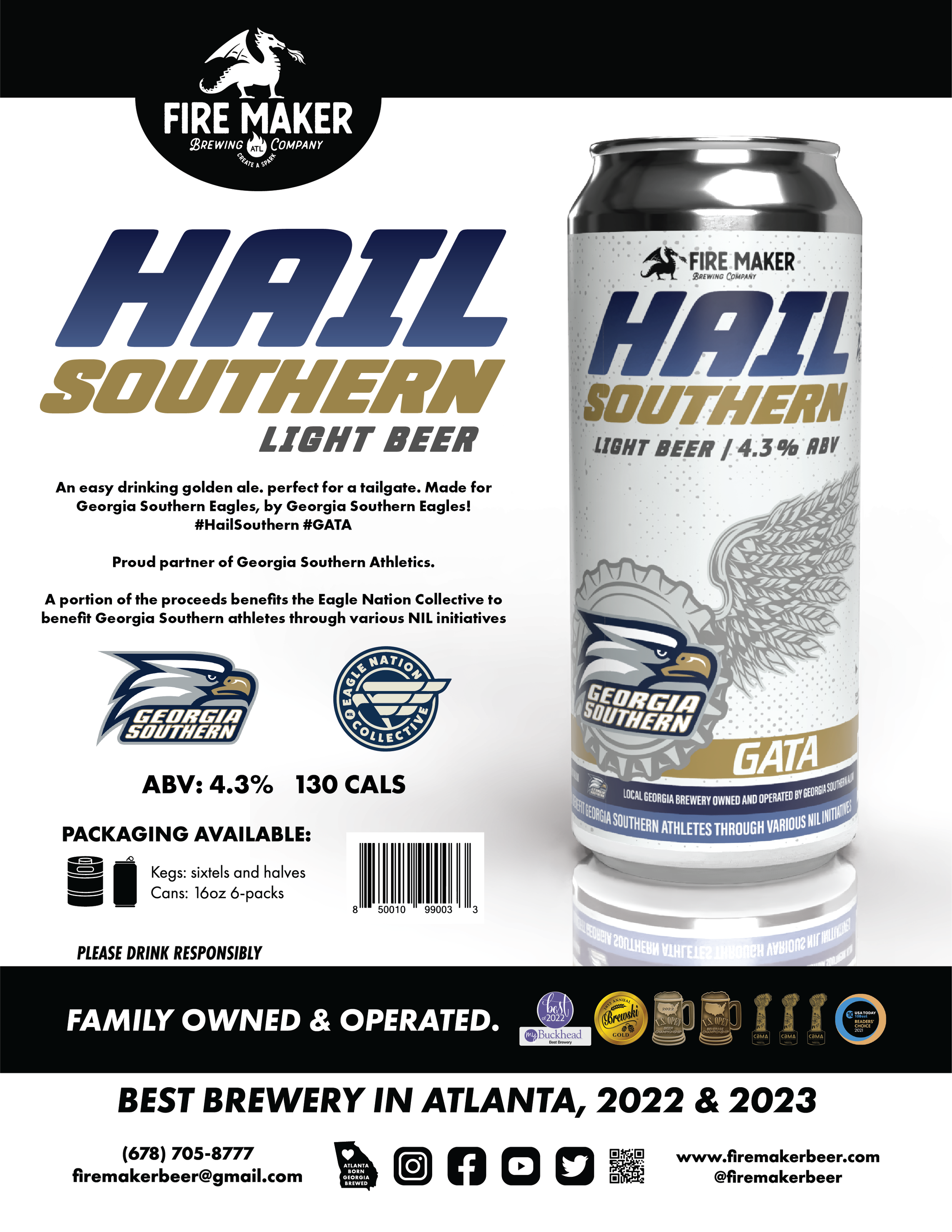 “As a Georgia Southern grad, I’m so excited to be able to do this for my school. Whenever you run into a fellow Eagle, the first thing they usually say is ‘Hail Southern!’ And that’s the perfect name for our beer. Made for Eagles by an Eagle. I think Eagle Nation will love it as much as we do.” -Elliott Hall, owner and co-founder of Fire Maker Brewing Company
